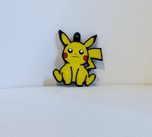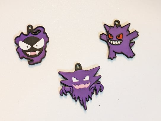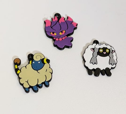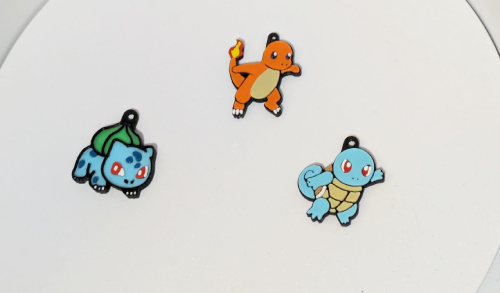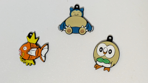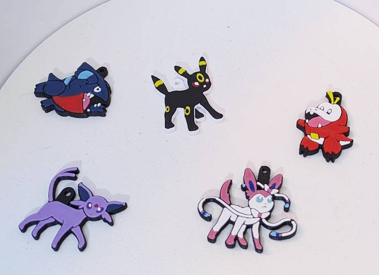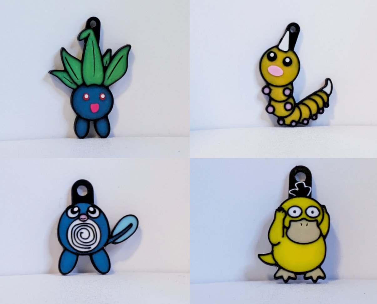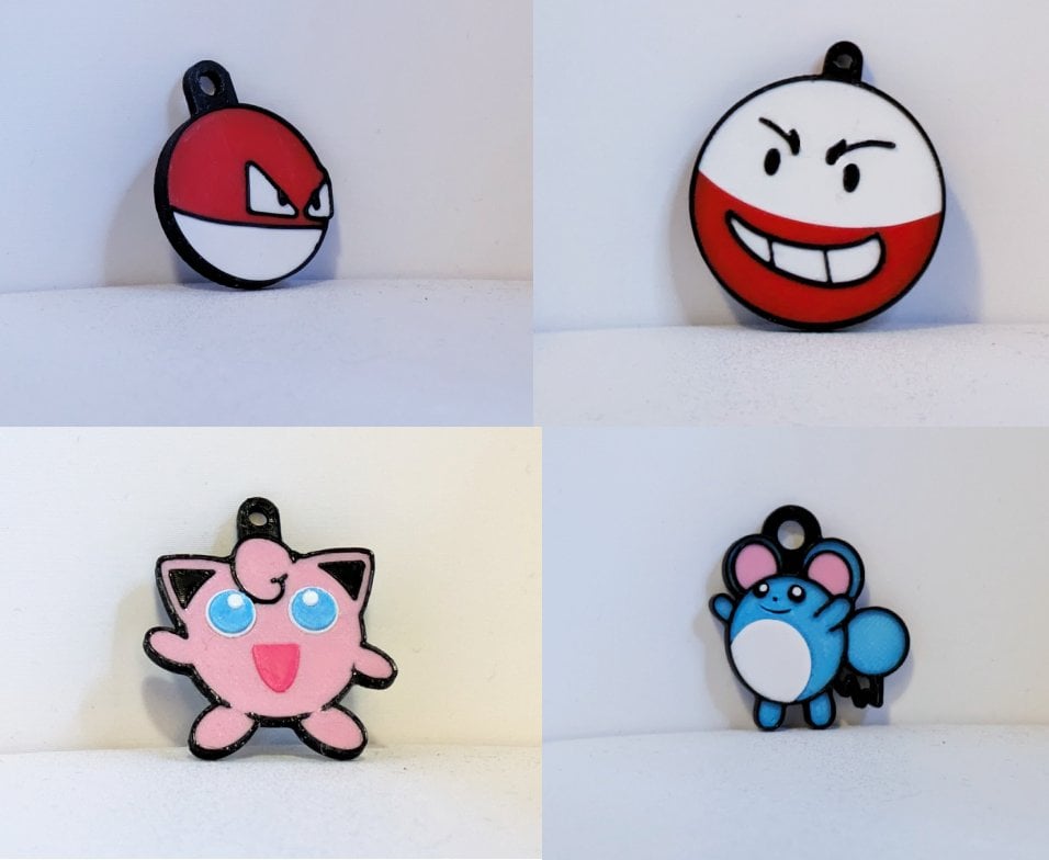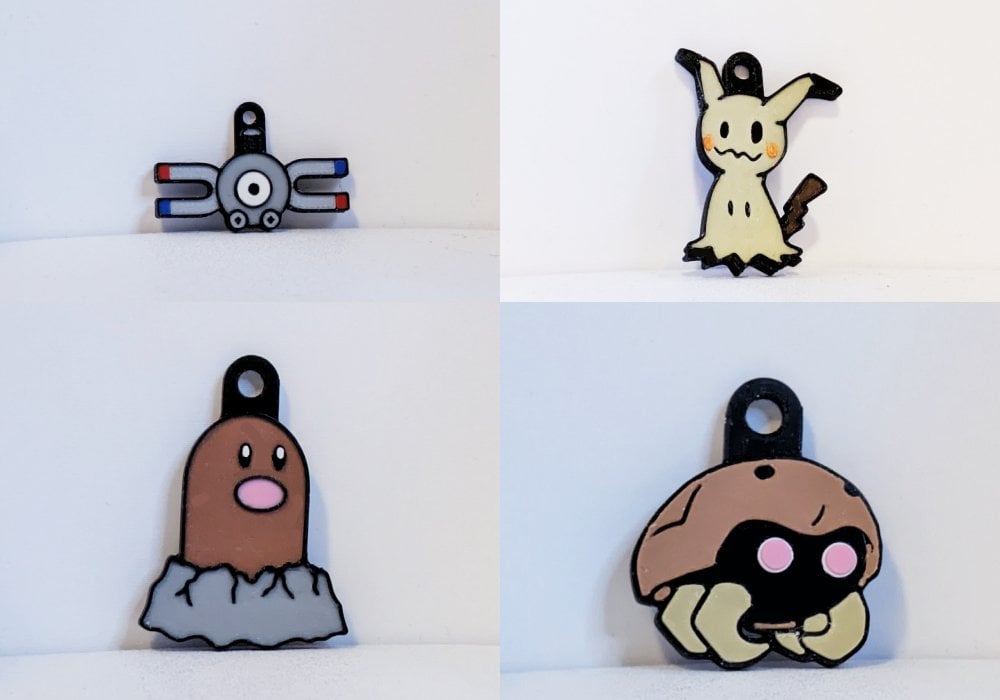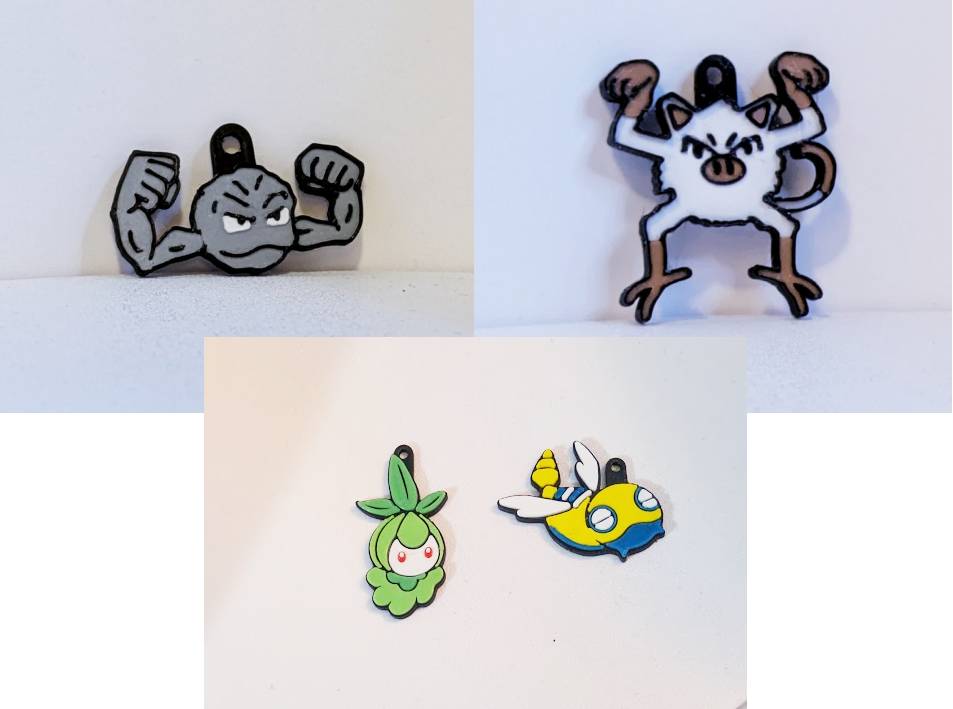 Small 3D-printed keychains featuring Pokemon! Each is around 1.5" wide or tall and made of polylactic acid (PLA).